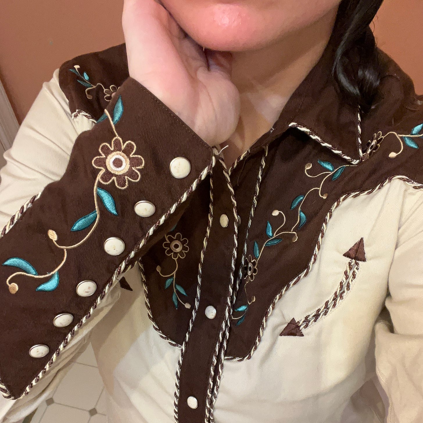vintage panhandle slim embroidered button-up shirt. gorgeous embroidery with pearl snap buttons. i had my eye on this for months on depop before i pulled the trigger. she is so beautiful in person.